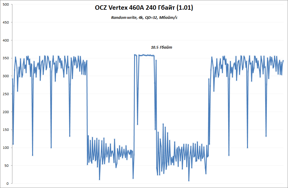 Не отличаются Vertex 460A и Vector 180 и при работе в условиях отсутствия команды TRIM: Vertex 460A так же, как и Vector 180, может принять на полной скорости до 10.5 Гбайт данных.