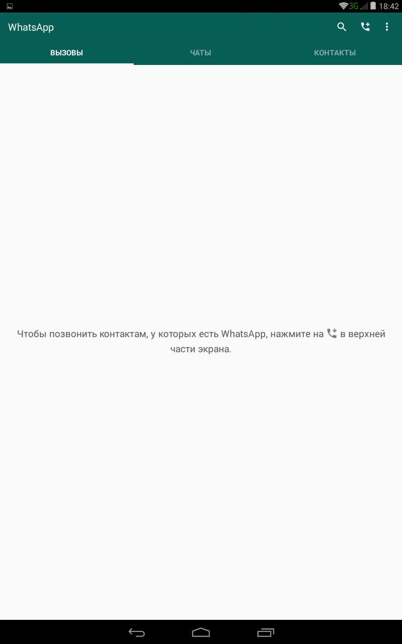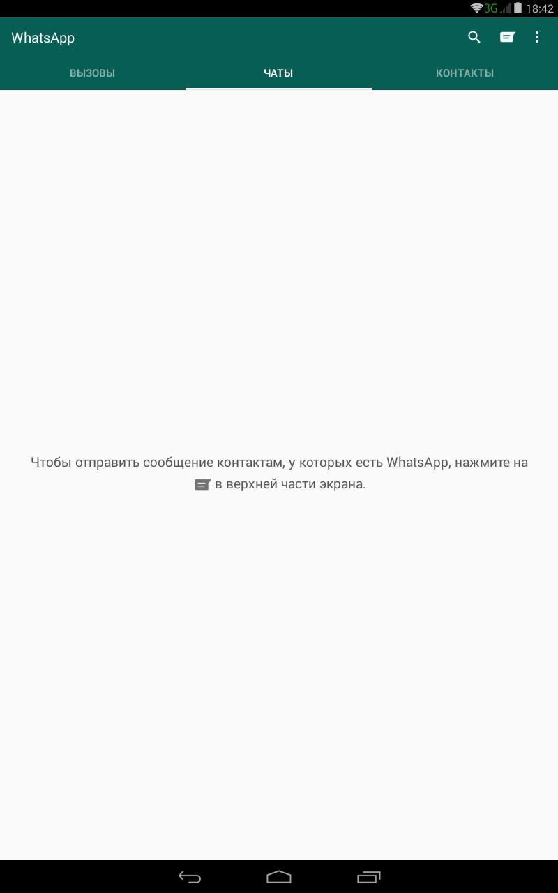 И вот перед нами главный экран, выполненный в материальном дизайне с тремя вкладками сверху: вызовы, чаты, контакты. Внизу услужливо поясняют, что нажать, чтобы написать сообщение.