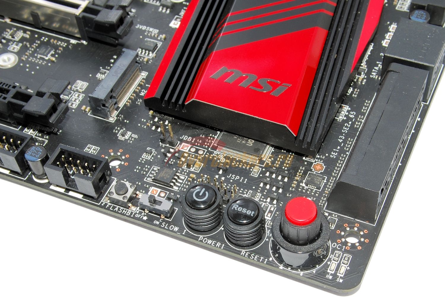 За кнопкой включения на фото традиционная для материнских плат MSI любого класса расположилась колодка JSPI1 для прямого программирования микросхемы флеш-памяти BIOS без ее выпаивания – путем подключения к колодке программатора.
