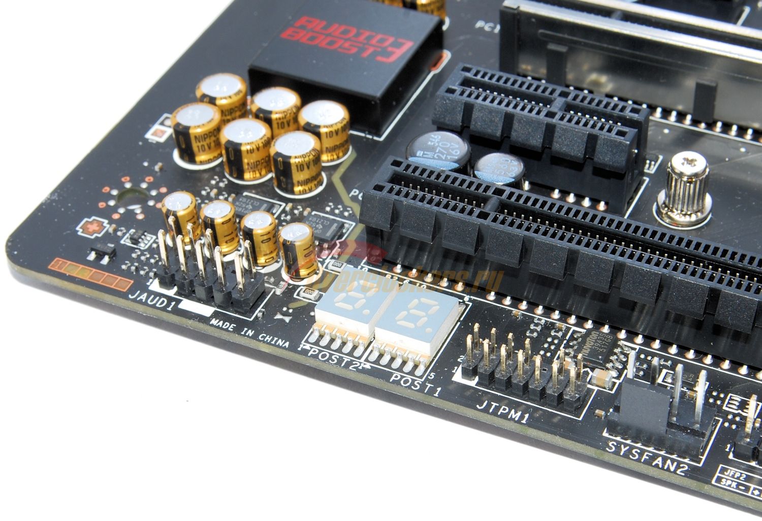 Под нижним слотом PEG, ближе к левому краю платы, мы найдем индикатор POST-кодов.