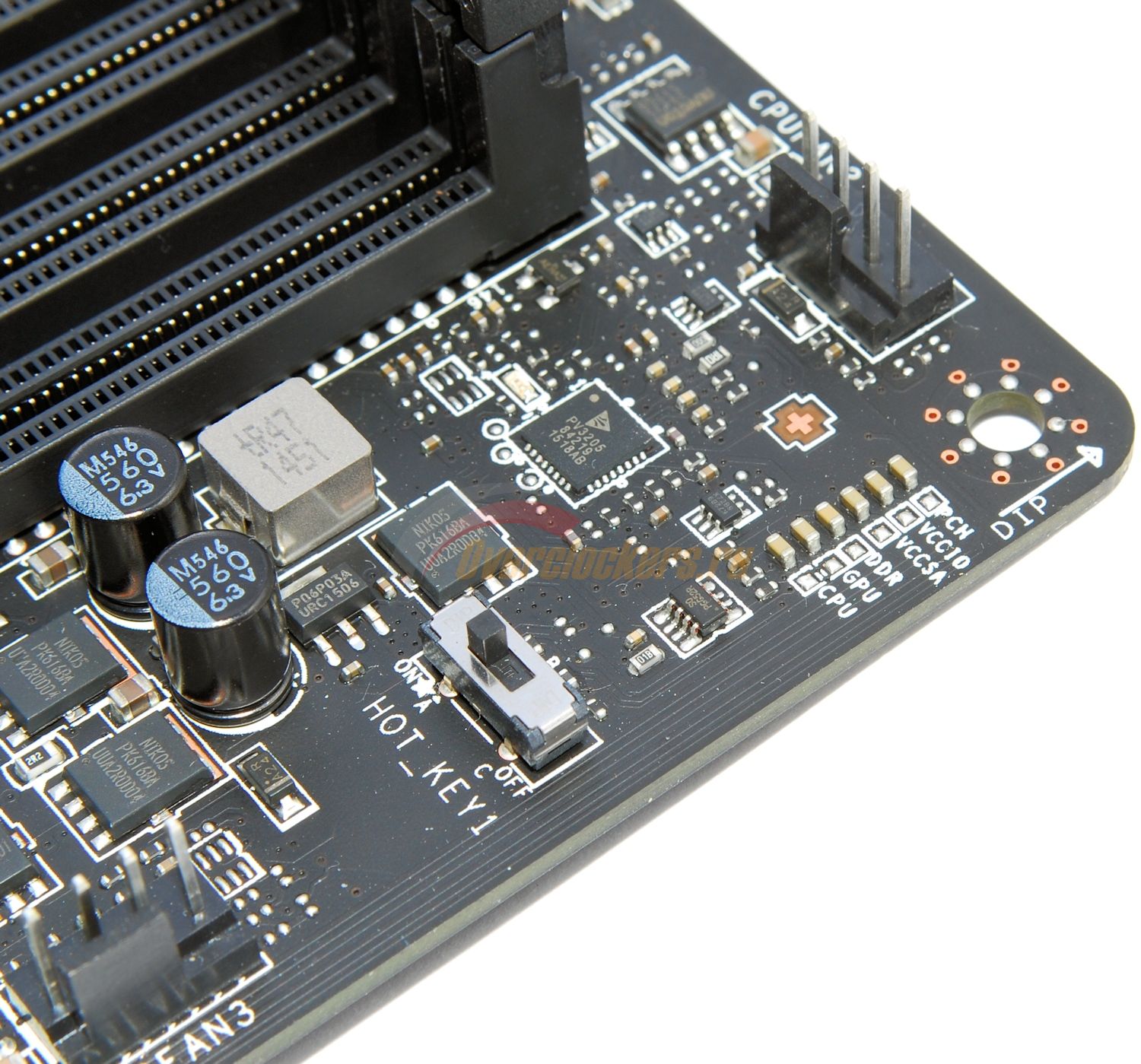 В верхнем левом углу платы размещены контрольные точки для замера напряжений мультиметром и переключатель HOT_KEY1.