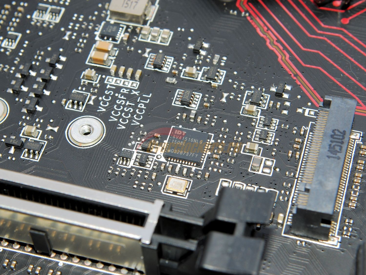 И тут же мы видим сердце системы – тактовый генератор IDT 6V41516NLG. Именно позволяет разгонять систему без оглядки на частоты PCI-E, DMI и SATA.