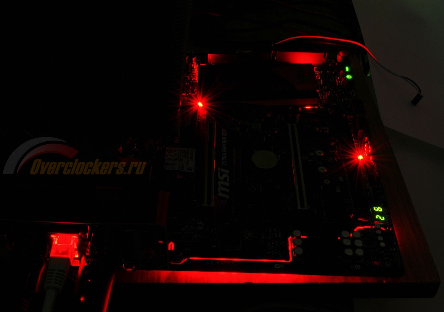 Крепление радиатора на наборе системной логики явно избыточное: четыре винта на небольшой площади. Кстати, если снять радиатор, то можно увидеть, что под каждым из его углов расположено по два светодиода декоративной подсветки, светящиеся красным. Для большей наглядности на фото они выделены красными овалами.