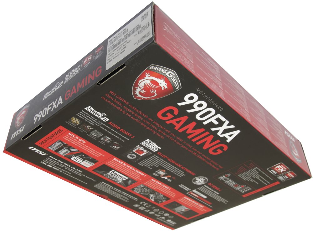 Правее в ряд выстроилась группа значков. Что у нас тут? USB 3.1, Audio Boost 2, Killer E2200, AMD FX и чипсет девятой серии. Вроде бы неплохой набор подобрался. Ниже можно обнаружить эмблему серии MSI Gaming и полное наименование модели.