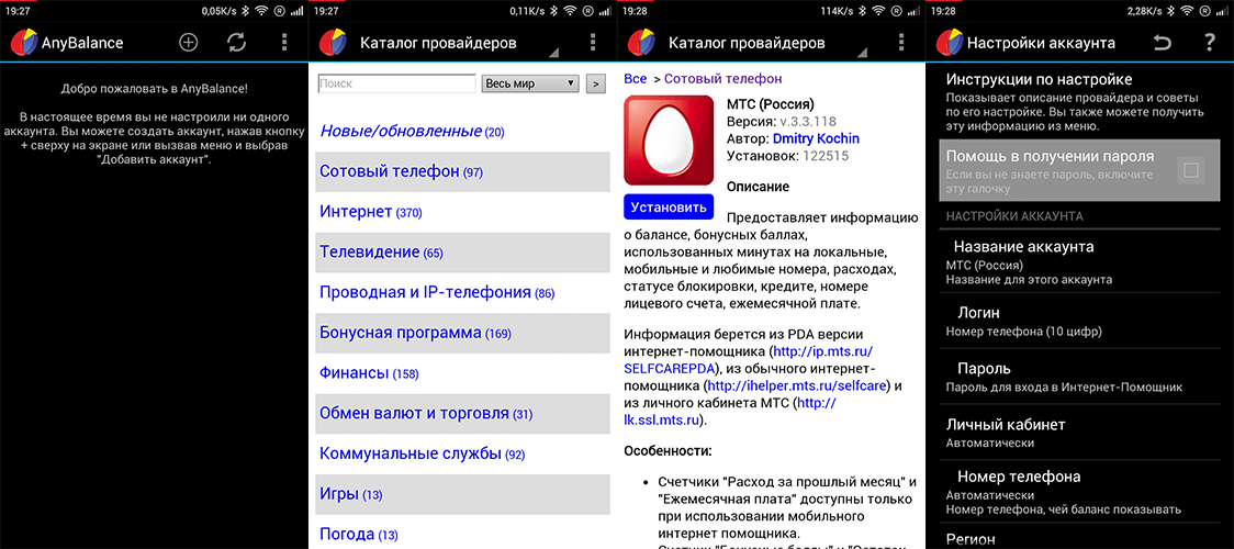 Еще в Any Balance есть очень интересная опция, которая называется «помощь в получении пароля». Если у вас нет пароля для входа в «личный кабинет» своего мобильного оператора, обязательно воспользуйтесь ею – это упростит весь процесс.