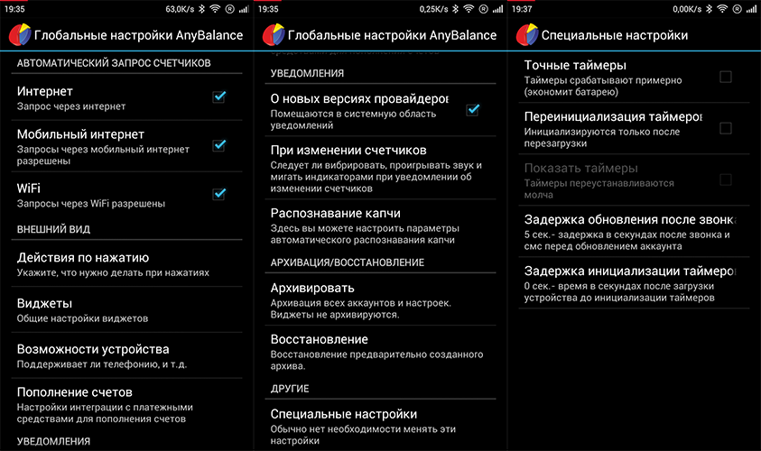 В настройках доступно указание того, при подключении сети какого типа может осуществляться обновление балансов, настройка внешнего вида и корректировка кое-каких дополнительных параметров. Естественно, есть функция «архивации/восстановления» данных и так далее, в целом, ничего необычного.