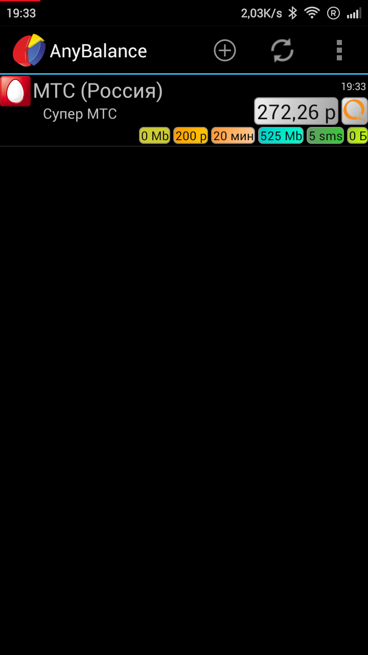После всех манипуляций мы оказываемся на главном экране Any Balance. Обновляем статус и видим наш аккаунт: количество денег на счету, количество бесплатных минут, остаток трафика, количество SMS-сообщений и прочие «счетчики». Все это настраивается. Нужен только баланс? Оставим его, а остальное уберем.
