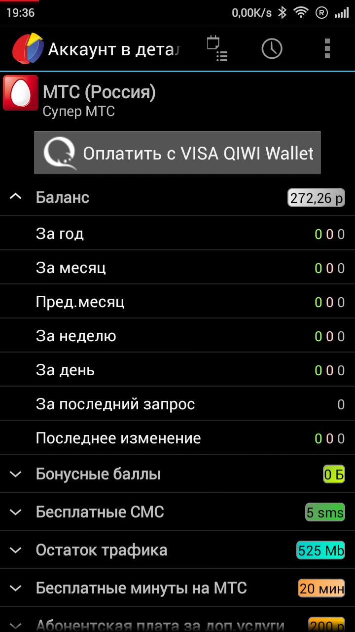 Если нажать на добавленный аккаунт, мы увидим статистику расходов за определенные периоды. Отдельно можно просмотреть статистику по всем категориям: деньгам, доступным мегабайтам, бонусам и другим расходам.