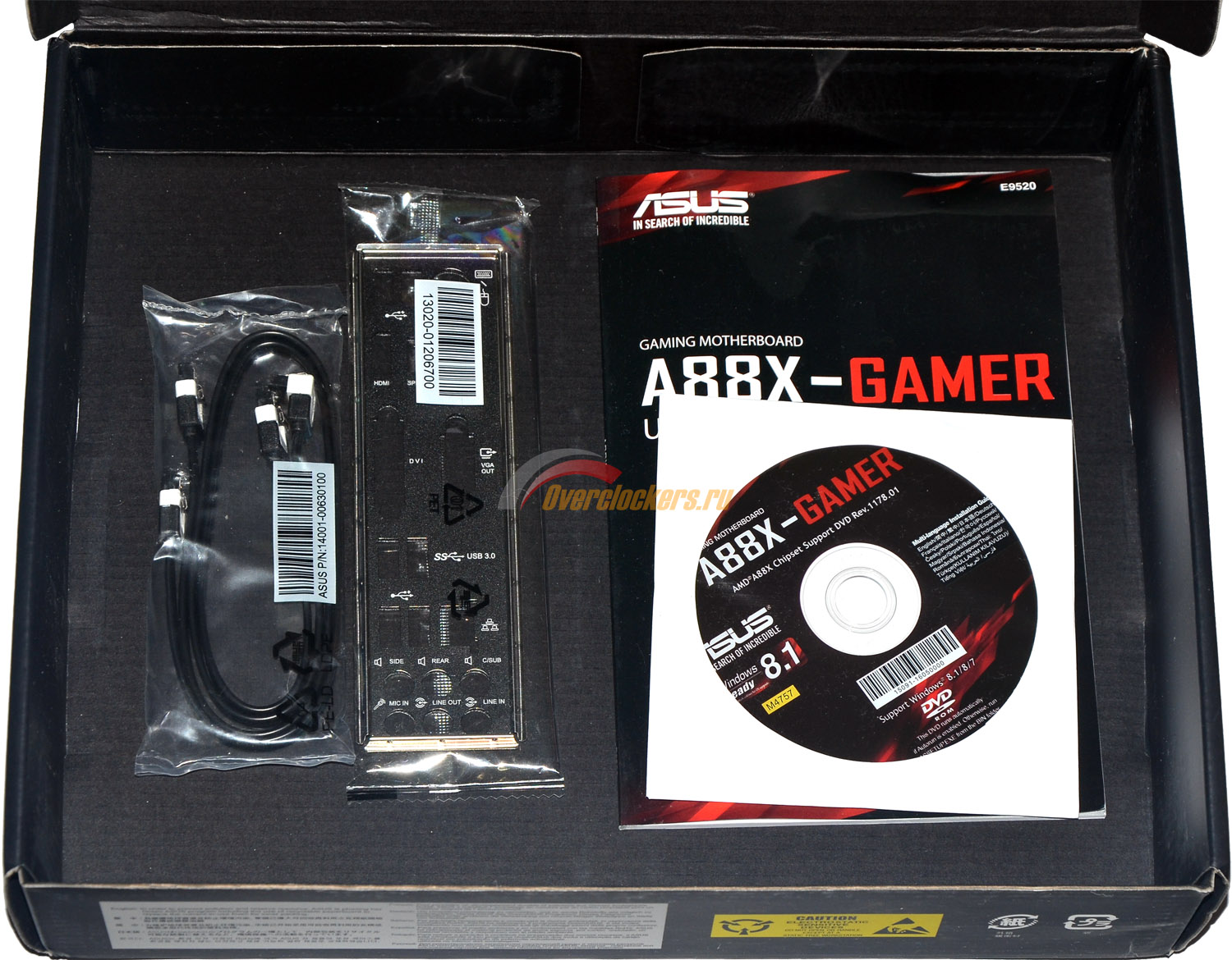 Под картонным поддоном на дне коробки расположен комплект поставки ASUS A88X-Gamer: