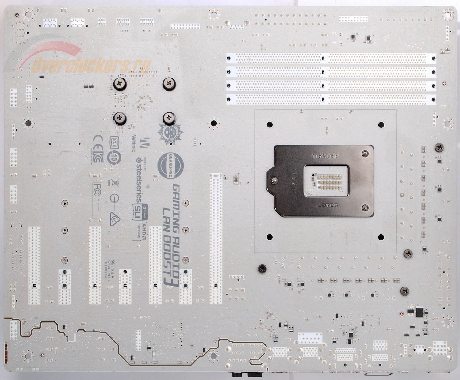 Эта технология уже давно отработана на звуковых трактах материнских плат и здесь перед ней та же задача: уменьшение наводок с целью достижения стабильной работы системы при высоких частотах памяти. При этом с обратной стороны платы эти полосы закрашены лаком и практически никак не выделяются.