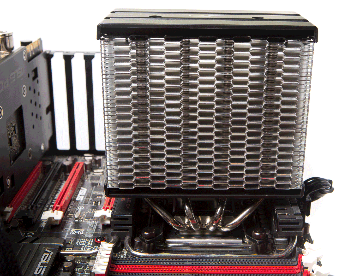 Кулер не перекрывает верхнего слота PCI-E на стендовой материнской плате, но находится к нему довольно близко.