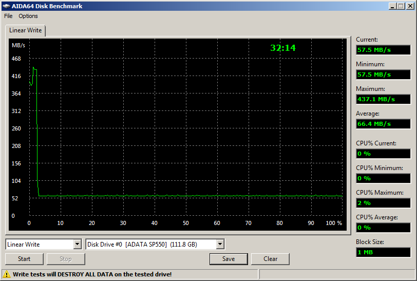 Затем проводится полная очистка накопителя путем подачи команды Secure Erase, после чего запускается тест Disk Benchmark из состава AIDA64 в режиме «Write» (размер блока установлен равным 1 Мбайт) – данный тест производит линейную запись всего объема носителя, попутно выводя информацию о процессе записи в виде удобного графика. Этот тест позволяет нам увидеть, насколько в целом накопитель стабилен, не возникает ли перегрева и какие, возможно, алгоритмы реализованы в микропрограмме.