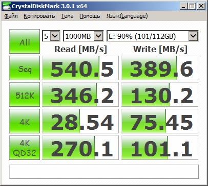 На накопитель записывается файл размером 1000 Мбайт, состоящий из случайных практически не поддающихся компрессии данных. Результат теста – среднее значение по итогам пяти линейных проходов чтения.