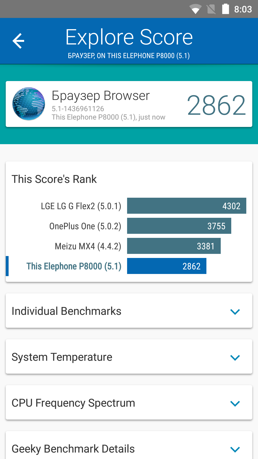 Elephone P8000 основан на однокристальной платформе MediaTek MT6753 (не обращайте внимания на старую версию CPU-Z, которая еще просто не знала о такой модификации данного чипа). Это чуть менее разогнанный вариант MT6752 с восемью ядрами Cortex A53, работающими на частоте до 1.3 ГГц.