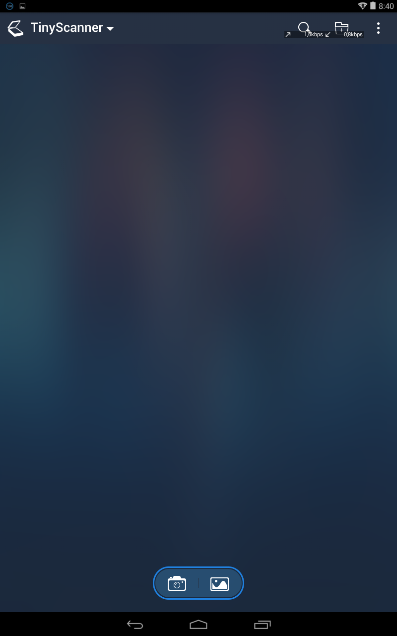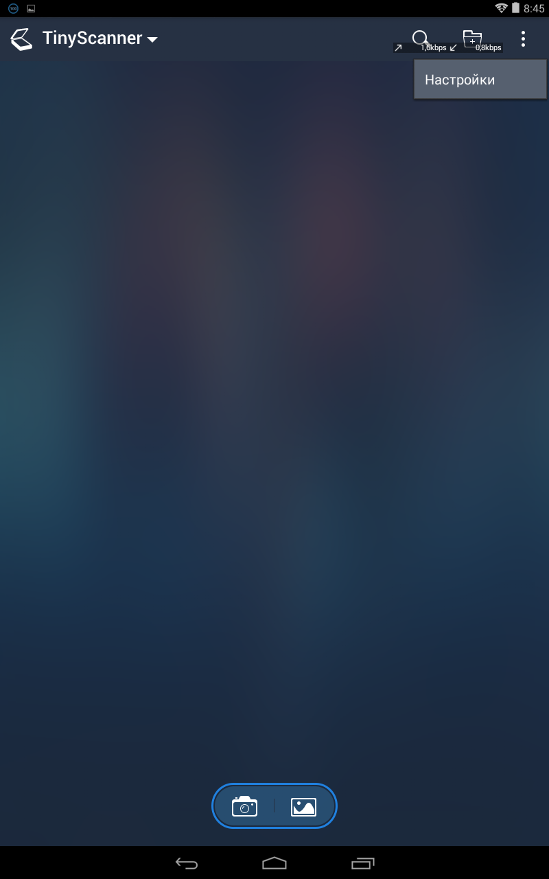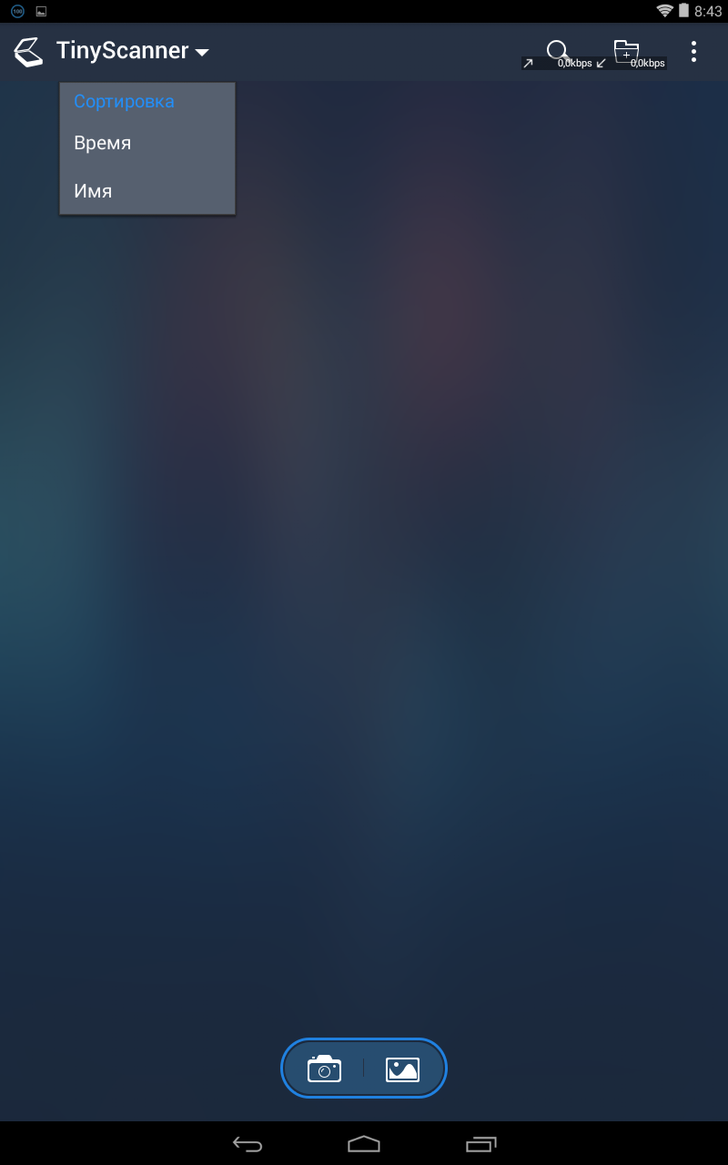 Первое, что нас встречает – приятный лаконичный дизайн в синих тонах. Главное окно заполняется сделанными сканами, и пока оно пустое. В самом низу две небольшие клавиши для снимка документа или открытия его с SD-карты.