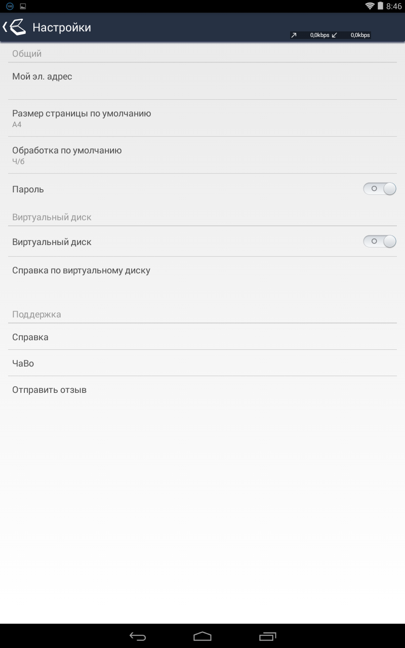 Помимо этого, можно настроить пароль (как же без него в бизнес-среде) и активировать виртуальный диск с привязкой к конкретному адресу фирменного сервера, куда можно кидать наши PDF. Ничего не скажешь, интересное решение. В самом низу традиционные ЧаВо, справка и отзыв.