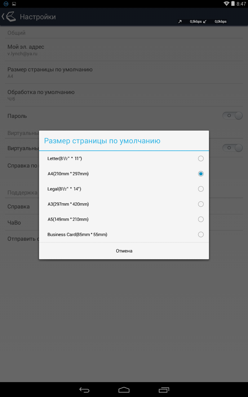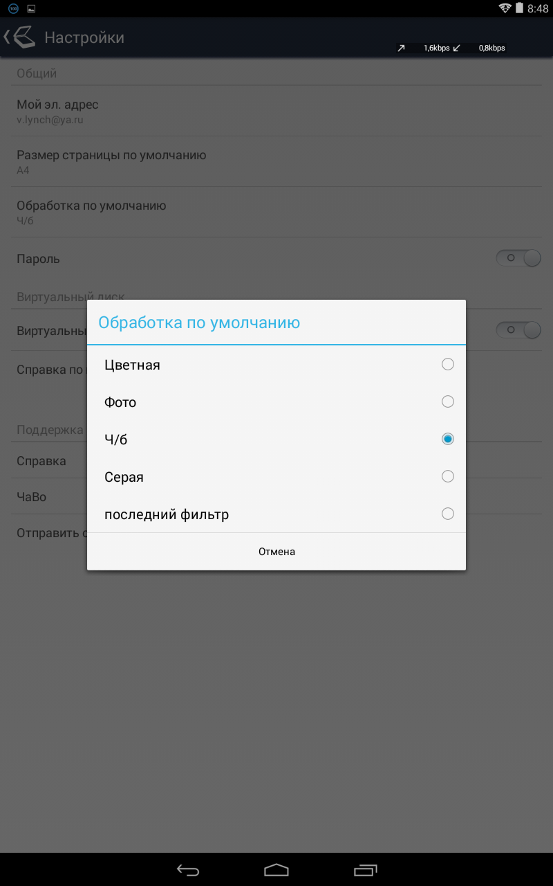 Настроек немного, но они полезны. В их числе стоит отметить возможность оставить свою почту, выбрать формат страницы (А4, А3, А5 и прочие), а также установить обработку изображения: цветное, фото, черно-белое, серое или последний используемый фильтр. Остановимся на монохроме.