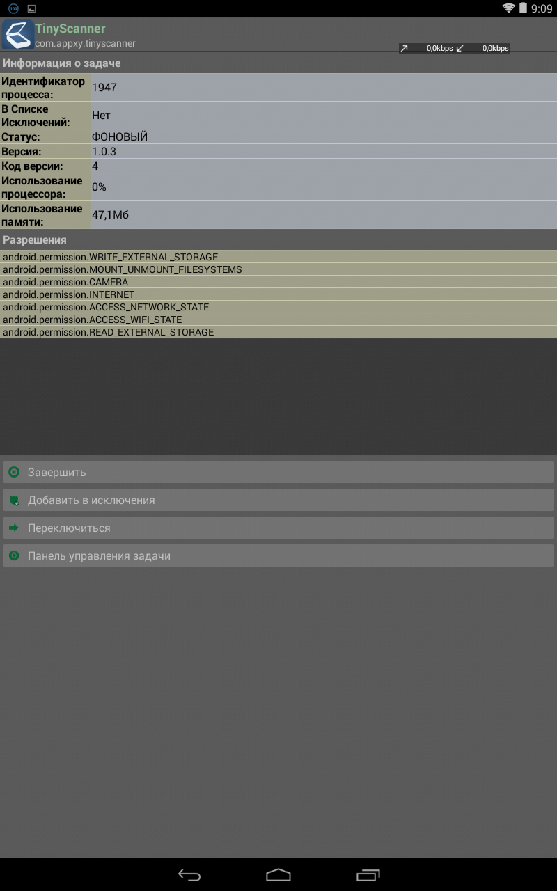 Традиционно начнем с ресурсов. Tiny Scanner нас приятно удивил – всего 47 Мбайт ОЗУ при нулевой нагрузке на процессор. При этом разрешений разумный минимум, а сам сканер работает с Android, начиная с третьей версии ОС.
