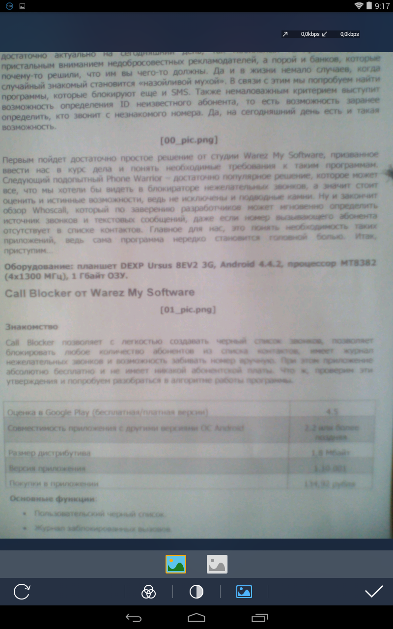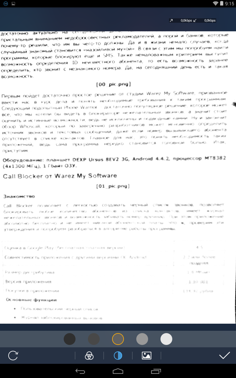 Не обошлось и без обрезки необходимой области в двух плоскостях. Есть фильтры а-ля графический редактор: можно настроить освещенность и контраст, а также применить серый и монохромный фильтр. Если немного помучиться, то расплывчатый текст действительно становится более четким, за что разработчику спасибо. Ну и, конечно же, все это дело можно сохранить.