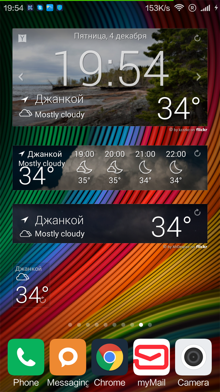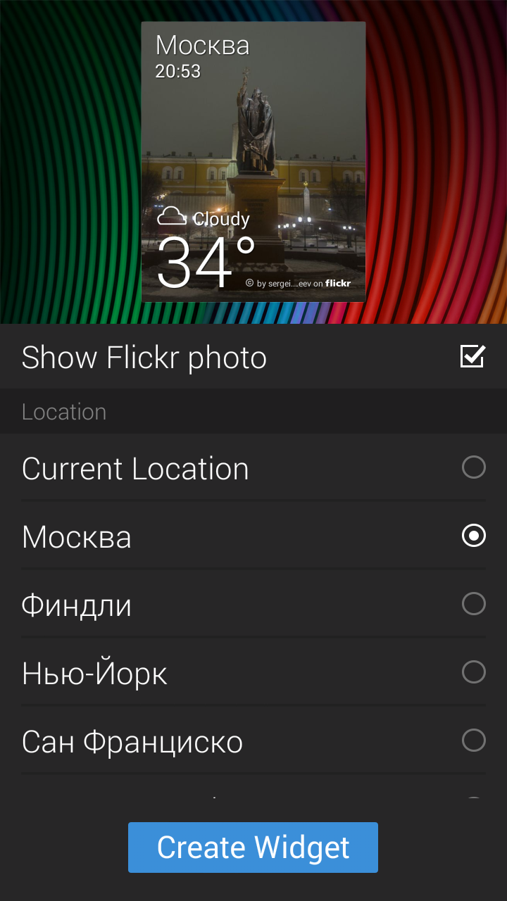 Еще в GO Weather EX есть поддержка виджетов, коих два вида по три размера каждый (2 x 1, 4 x 1, 4 x 2). Количество оформлений просто не счесть, так как поддерживаются темы сторонних разработчиков.