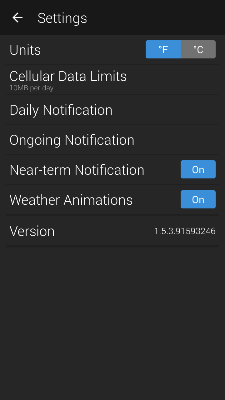 Настройки приложения «Yahoo Погода» нас не удивляют. Мы можем сменить единицы измерения температуры, установить количество трафика для обновления погоды, а также включить анимацию и оповещения о смене погоды.