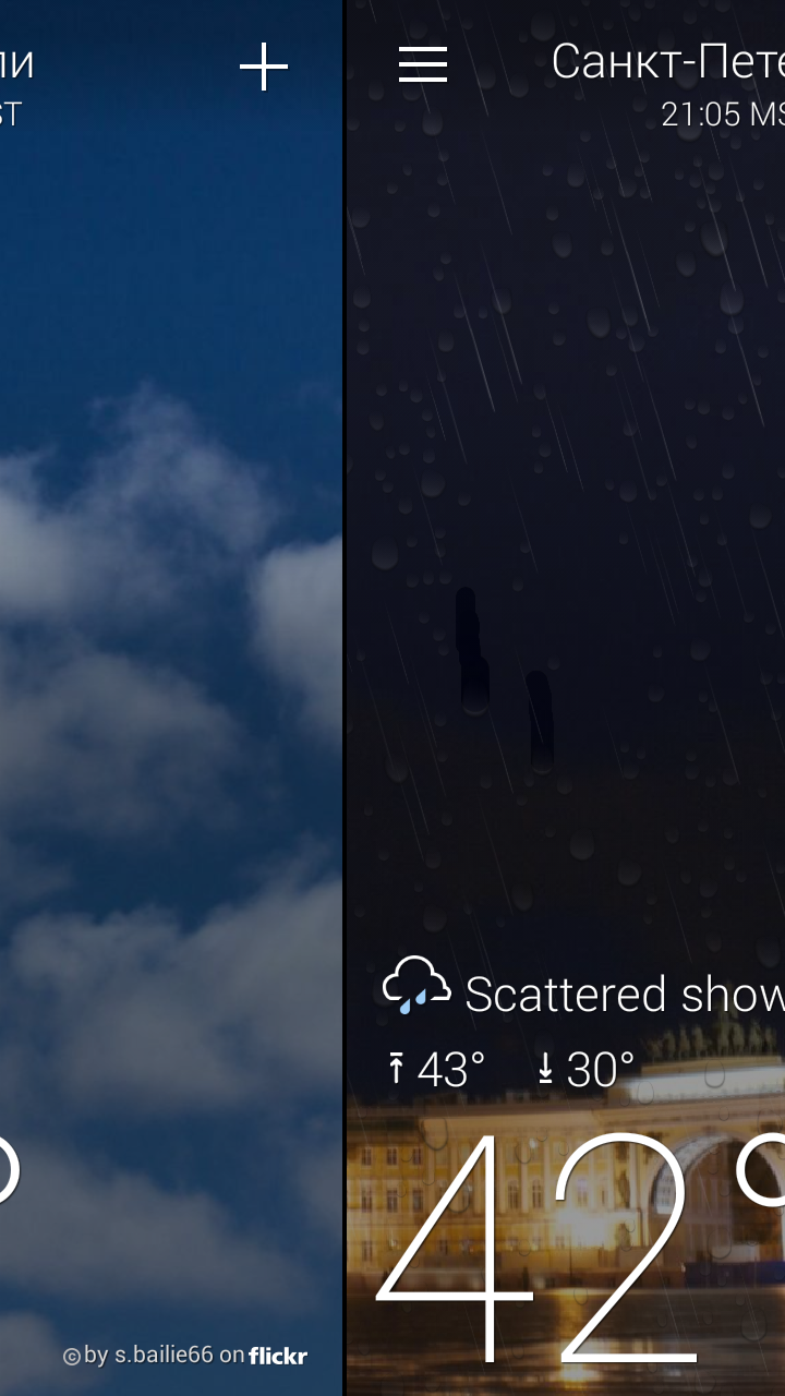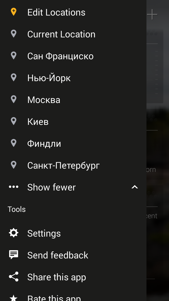 Если сделаем свайп вправо, то откроется дополнительное меню, где можно добавить несколько городов, чтобы быстро переключаться между ними. Кстати, сделать это можно и обычными нажатиями на левую и правую части экрана, что гораздо удобнее.