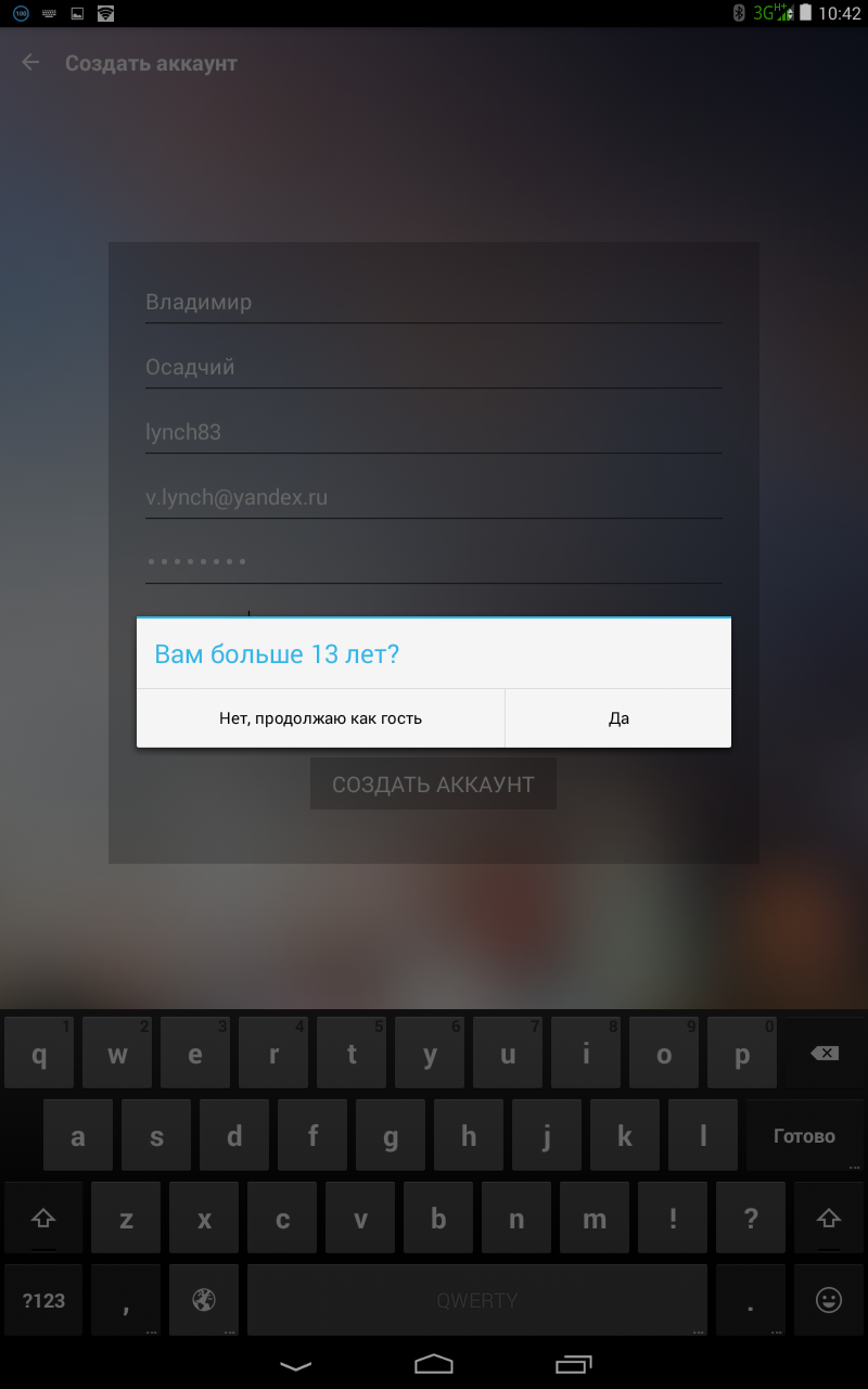 Сама регистрация несложная происходит при использовании аккаунта Google+ или Facebook. При этом, как оказалось, войти через социальные сети не получается, так как программа почему-то сообщила об отсутствии интернет-подключения, хотя с последним все в порядке. Странно конечно… Но не буду отчаиваться и попробую пройти обычную регистрацию. Для этого необходимо указать электронку, фамилию и имя, ник и задать пароль. При этом обязательно спросят, если вам 13 лет. Бред какой-то.