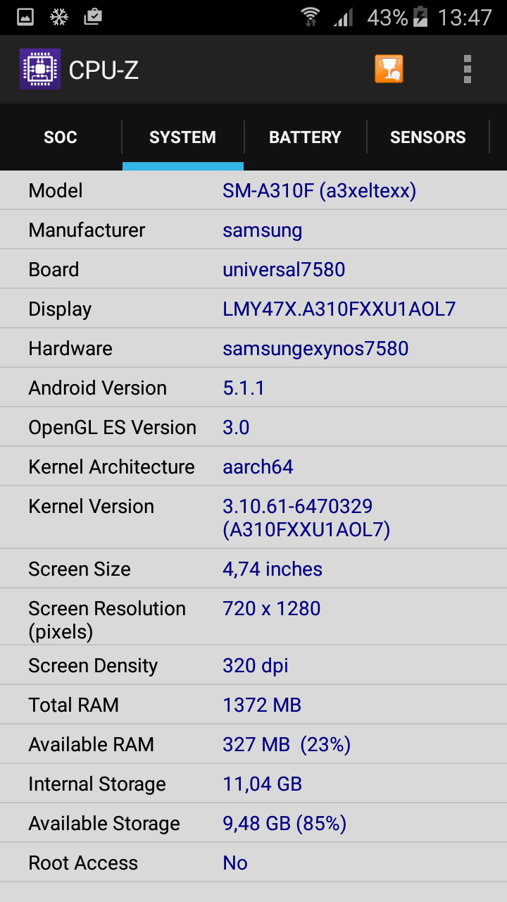В то же время утилита CPU-Z определяет Samsung Exynos 7580, который является восьмиядерным решением на ядрах Cortex-A53, чего на практике быть не может. Поэтому остается два варианта – либо перед нами Exynos 7578, либо Snapdragon 410. Судя по тестам, это все же первый вариант, но я могу ошибаться.