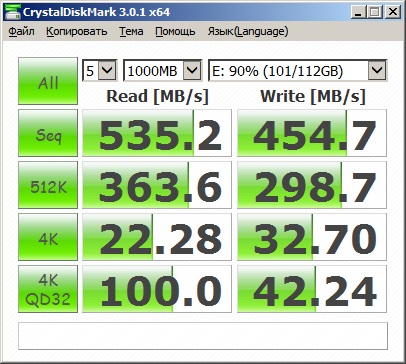 С помощью CrystalDiskMark (64bit) 3.0.1 в режиме случайных данных производится замер производительности четыре раза: