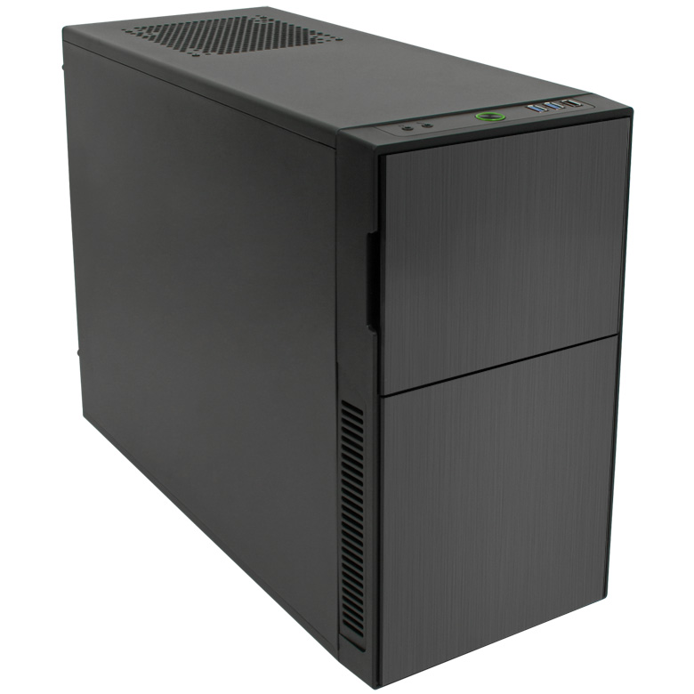 Корпус изготовлен из 0.8-мм стали, оборудован качественной шумоизоляцией на битумной основе, съемными заглушками вентиляционных отверстий ModuVent, а также поддерживает габаритные комплектующие и достаточное количество накопителей.