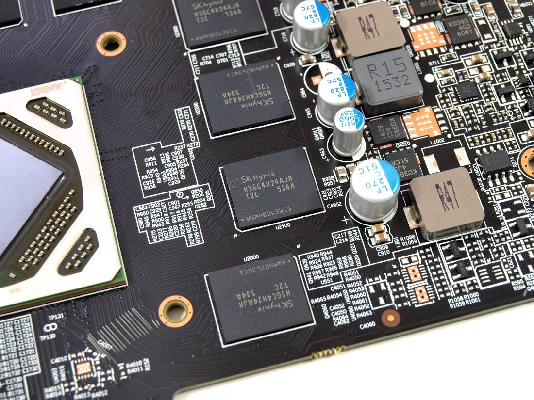 Новинка оснащается четырьмя гигабайтами видеопамяти, которые набраны восемью микросхемами H5GC4H24AJR производства SKhynix.