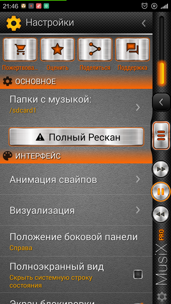 Аудиоплеер MusiX Player предлагает все необходимые настройки и параметры, начиная от изменения анимации в меню и заканчивая установкой действий на двойное-тройное нажатие по клавише гарнитуры.