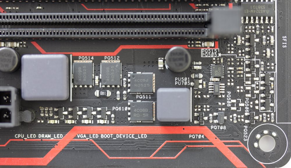 Однако вернемся к оформлению. Прежде всего теперь радиаторы стали красными. Кроме этого появилось множество красных полос, которые нанесены на матовую черную поверхность печатной платы. В целом вид получается достаточно эффектный, а учитывая наличие красной подсветки и вовсе привлекательный.