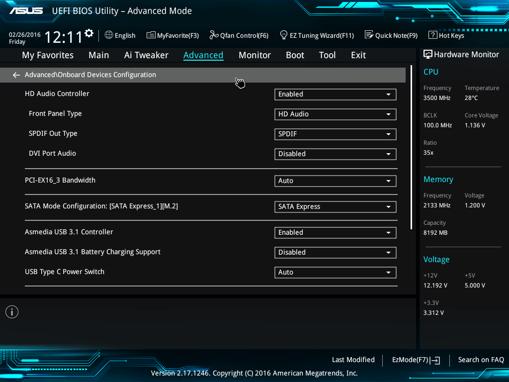 В разделе BIOS в закладке Onboard Devices Configuration есть опция SATA Mode Configuration, отвечающая за режим функционирования M.2 и SATA Express. Поскольку на оба выделяется четыре линии PCI-e, то придется выбирать что-то одно. Так, при подключении накопителя через M.2 в SATA Mode Configuration следует выбрать SATA Express, который при этом отключается. При задействовании SATA Express следует ставить эту опцию в M.2.