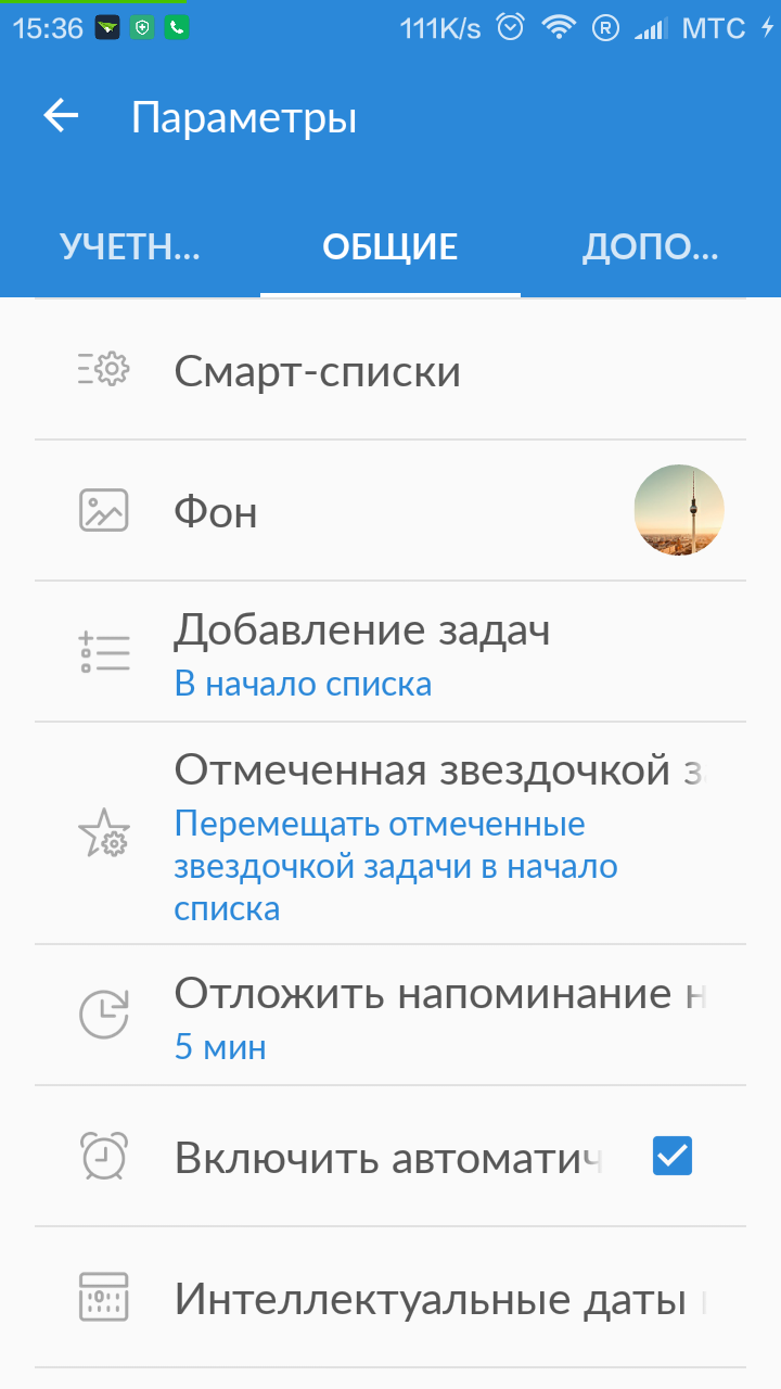 Параметры Wunderlist не блещут своей гибкостью. Все, что мы можем – настроить пару пунктов отображения и оповещения, сменить фон и подключить умные часы.
