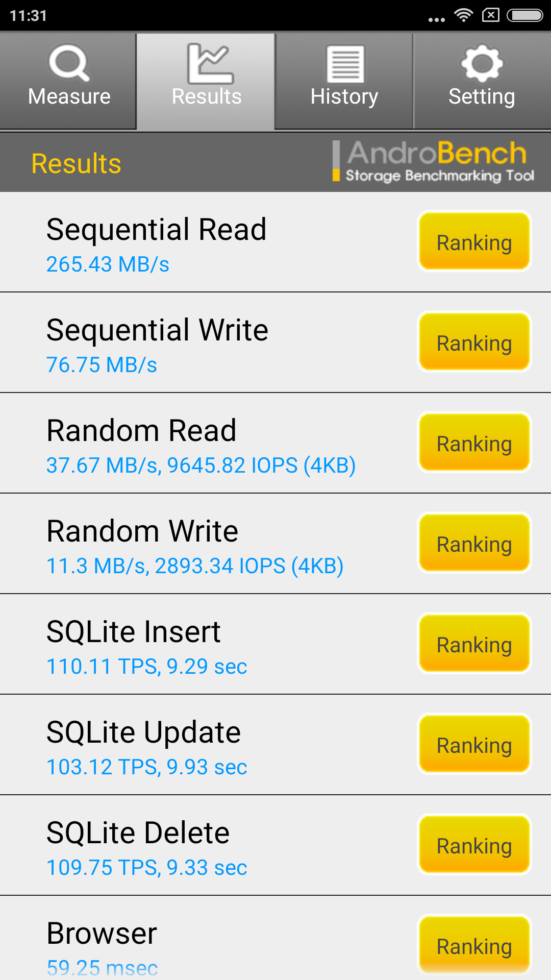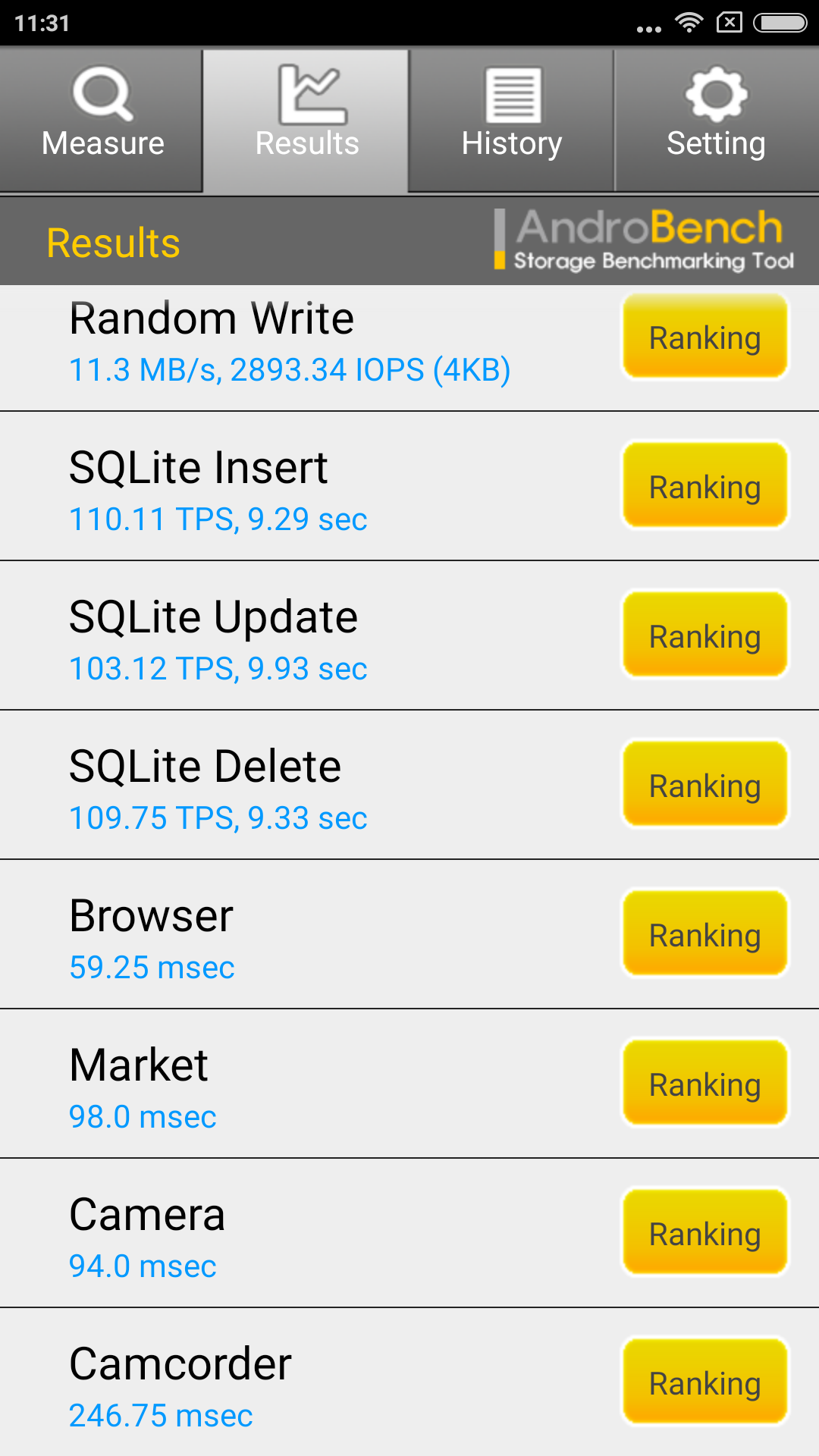 Скорость работы файловой системы была протестирована при помощи приложения AndroBench: