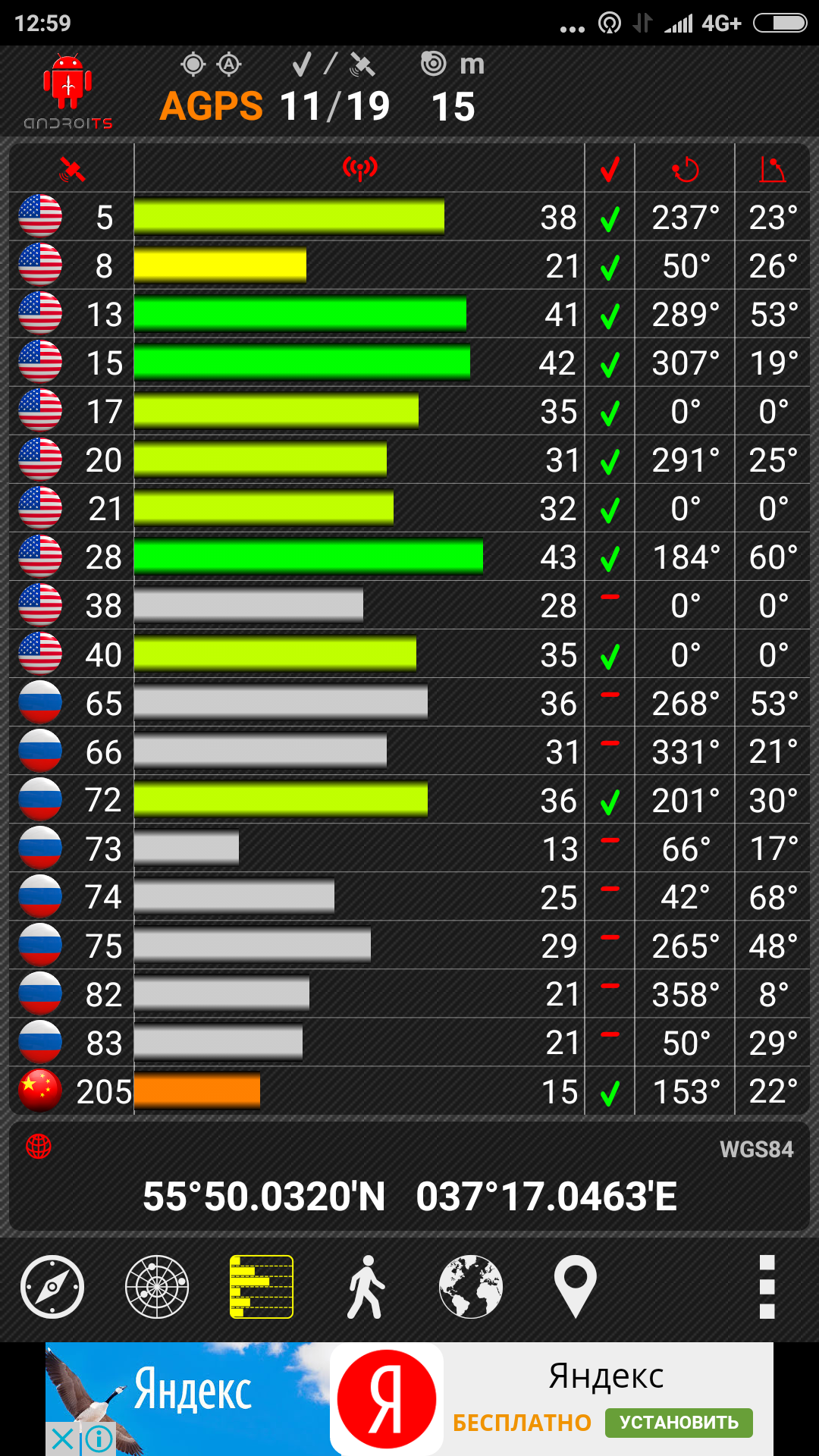Для определения местоположения есть системы GPS, ГЛОНАСС и китайская BeiDou. Работают они нормально, смартфон порой подцепляется даже к китайским спутникам. «Холодный» старт занимает приблизительно 3.5-4 минуты, а «горячий» до минуты, либо что чаще – мгновенно. Прием сигналов со спутников стабилен, трек на карте отображается без искажений и перебоев.