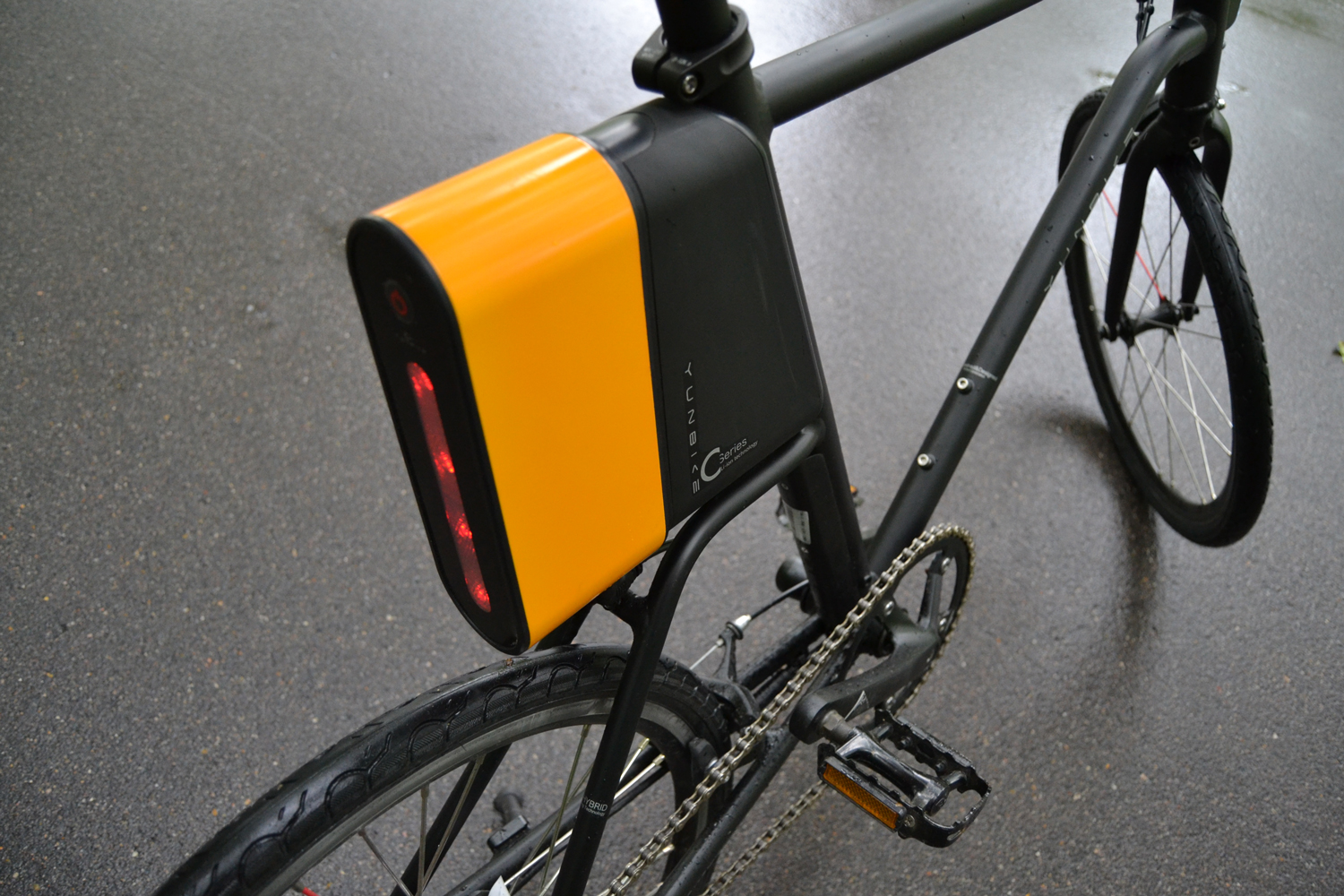 Задний фонарь состоит из красного светоотражателя и нескольких красных светодиодов. Он встроен в аккумулятор и при зарядке служит индикатором заряда.