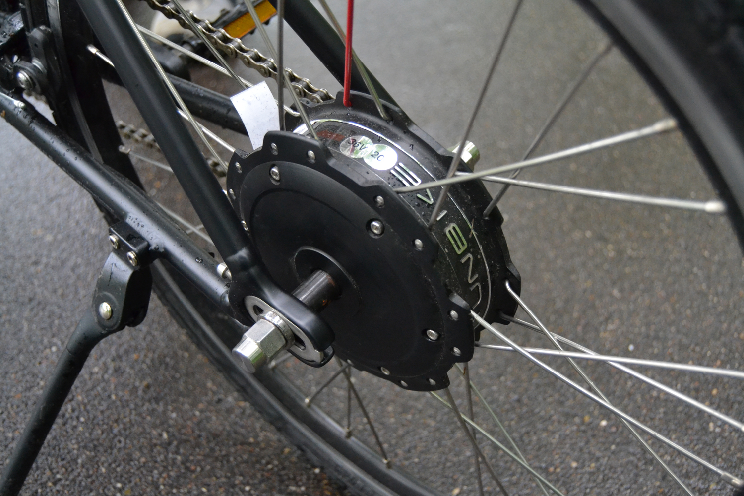 Сам электромотор объединен с задним колесом, а его корпус играет роль основания колеса. Питание подается по силовому проводу, закрепленному на нижнем левом пере рамы. Напряжение в бортовой сети высокое – 36 В. Мощность самого двигателя – 180 Вт, что примерно равно 0.25 лошадиной силы. Вроде бы немного, но и масса, которую необходимо перемещать, относительно невелика.