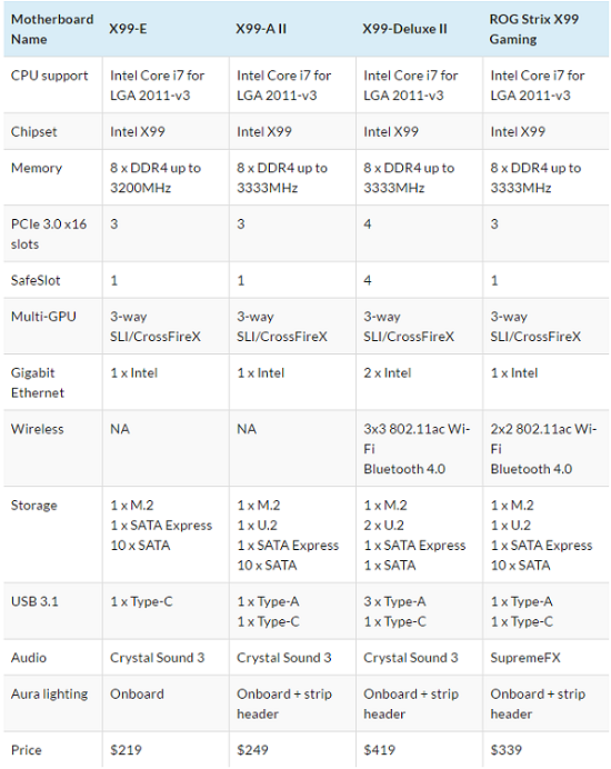 Младшие модели, если продукты на базе Intel X99 вообще можно назвать таковыми, в основном располагают базовым набором интерфейсов, который заложен в возможности набора системной логики и процессора. Среди сторонних функций они предлагают лишь порты USB 3.1, в то время как Deluxe II и Strix «нафаршированы» дополнительными интерфейсами и оснащены модулями беспроводной сети. Сравнить характеристики версий можно при помощи таблицы: