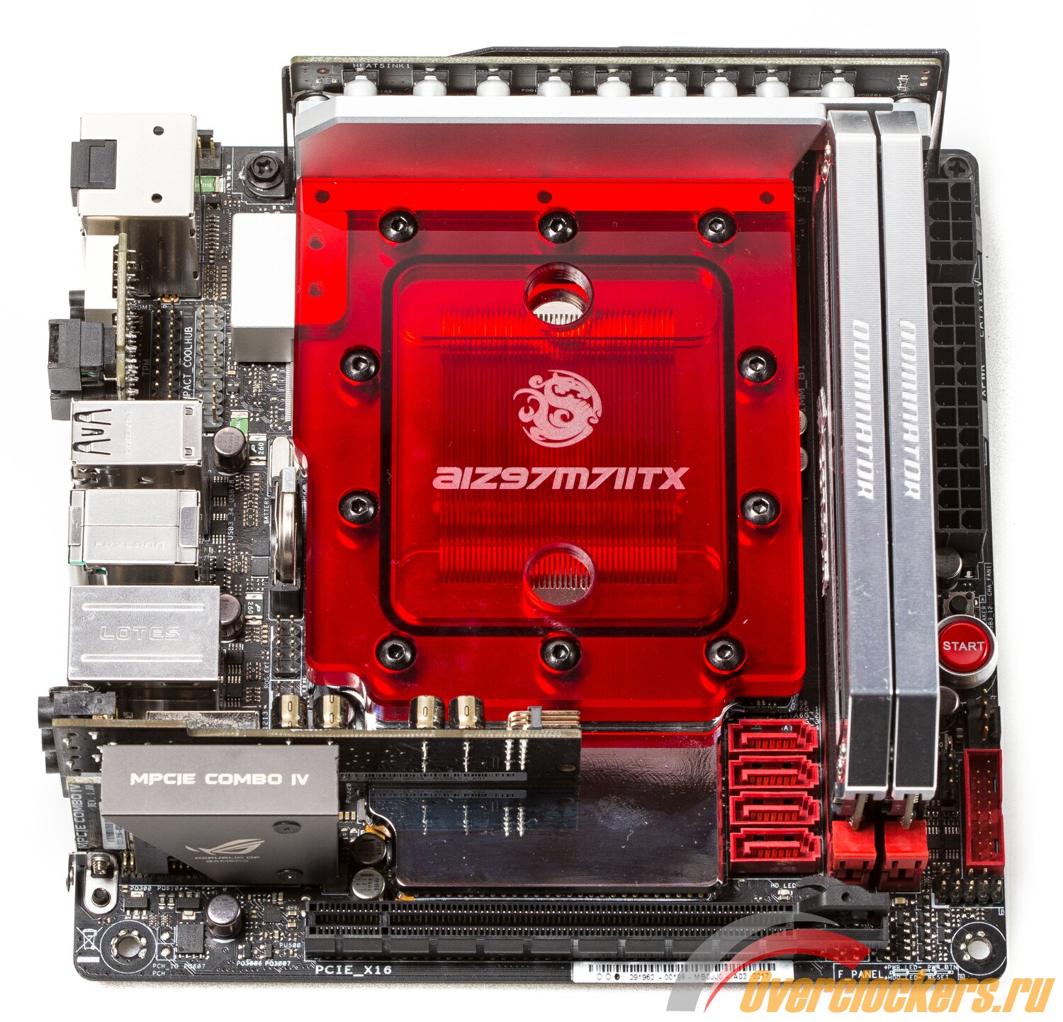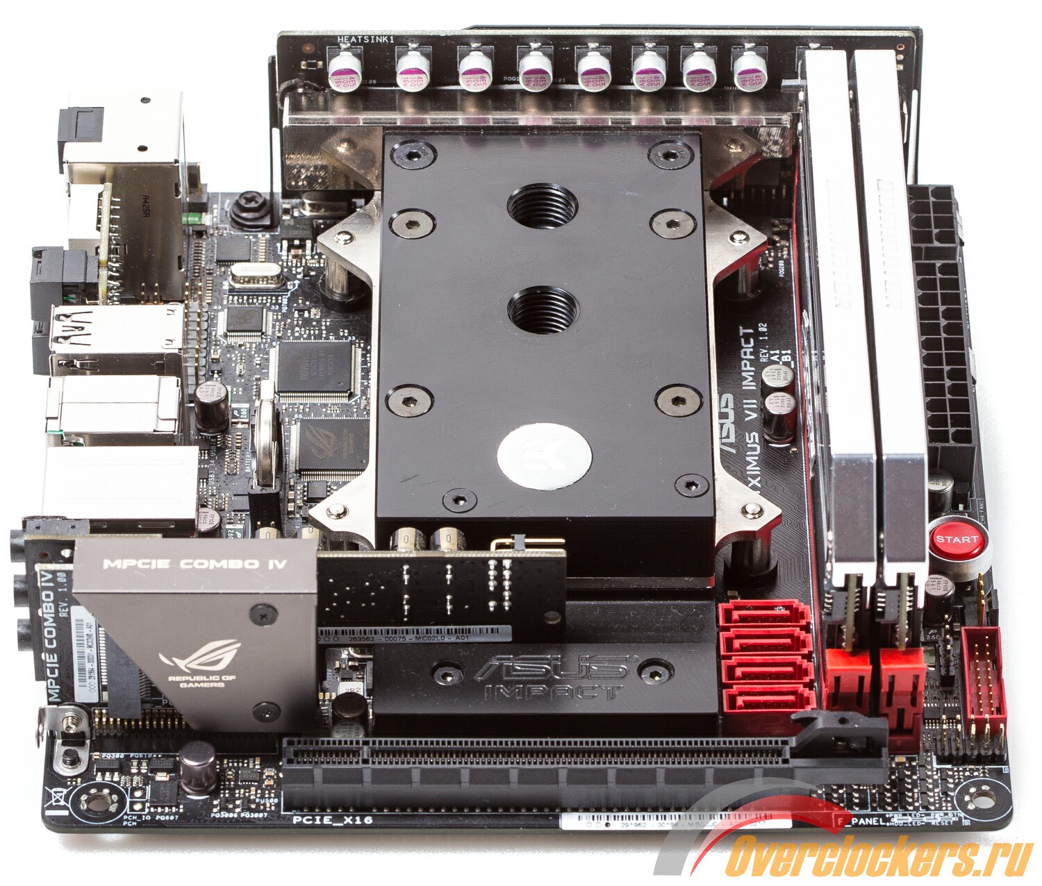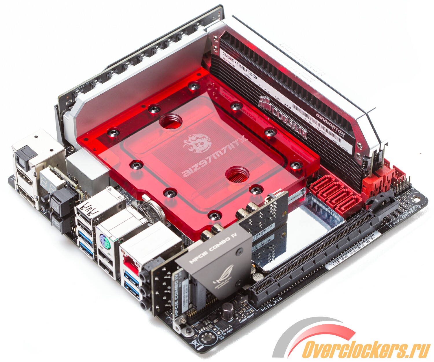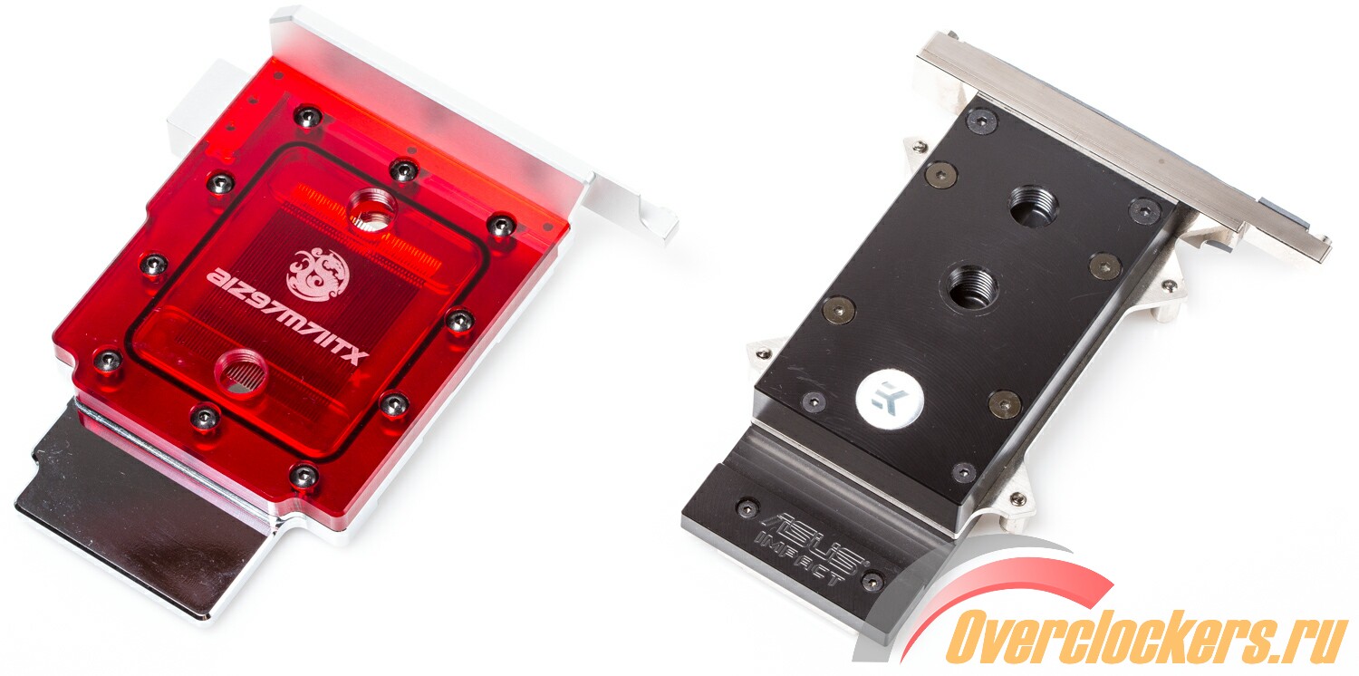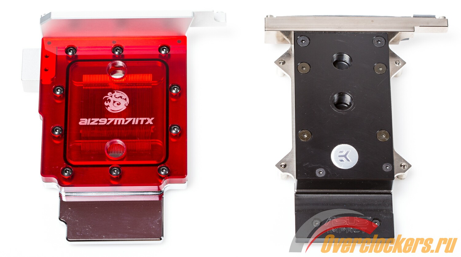 Но главный герой у нас будет один – Bitspower AIZ97M7IITX Nickel Plated (Bitspower BP-WBAIZ97M7IITXNPAC-RD). Ну а компанию ему составит уже известный вам по проекту «coreROG» fullboard EK-FB ASUS M6I Acetal+Nickel, который подходит не только для седьмой версии Maximus Impact, но и для шестой. Основной же темой станет противостояние брендов Bitspower и EKWB.