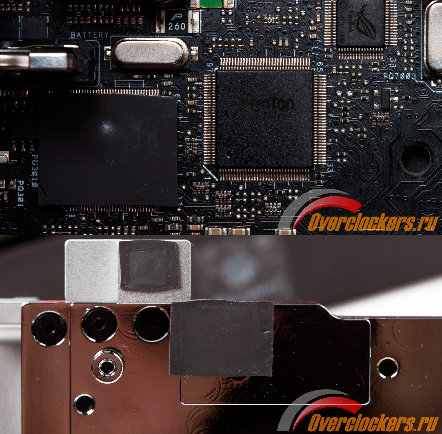 Кроме того, нужно отрезать три квадрата термопрокладок: два больших и один маленький. Они предназначены для микросхем 035-A2 с логотипом «Republic of Gamers», Nuvoton NCT6791D и iROG.