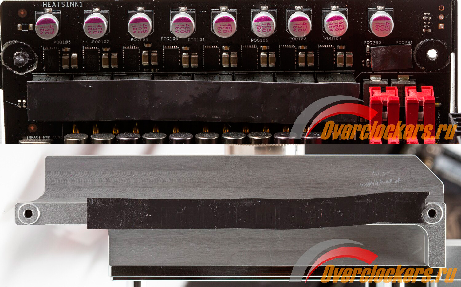 Второй алюминиевый съемный радиатор гораздо большего размера, поскольку должен охлаждать восемь фаз питания. Он получил привычное для радиатора VRM двухуровневое основание и крепится к медному основанию на три винта.
