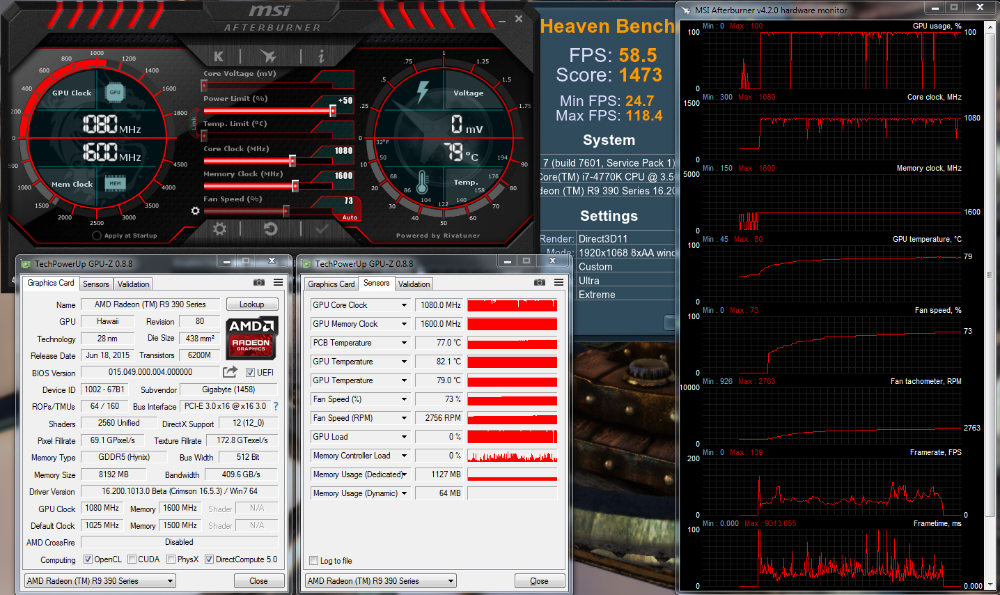 Gigabyte Radeon R9 390 G1 Gaming стала тише и прохладнее: 75°C против 79°C и 2400 об/мин против 2700 об/мин. Если откорректировать еще и вентиляторы, то видеокарту можно сделать бесшумнее. А как обстоят дела с разгоном?