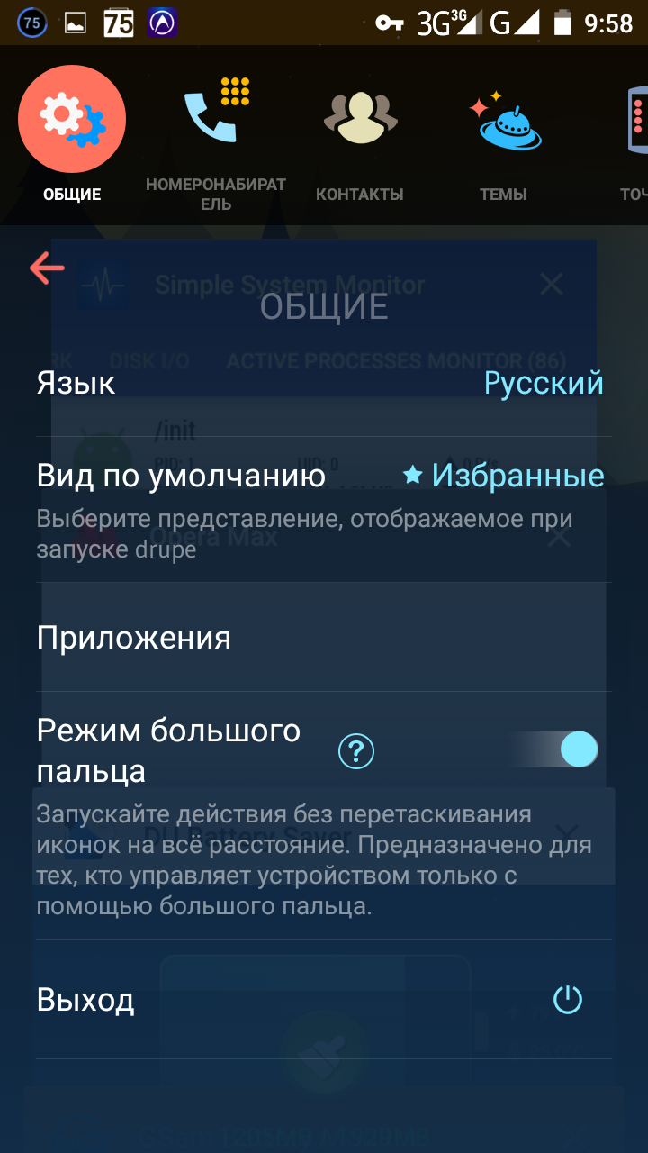 В «Общих» параметризируем вид главного окна по умолчанию – все контакты, последние и избранные. Ниже доступно выбрать приложения, которые располагаются в правой части экрана. Это могут быть мессенджеры, органайзеры, электронная почта, напоминалка и карты. Ничего не скажешь – удобно. Также можно активировать так называемый режим большого пальца, то есть действия запускаются без перетаскивания иконок на все расстояния. Аминь! Беру свои слова обратно, так как таким макаром программой удобно управлять и на ходу.