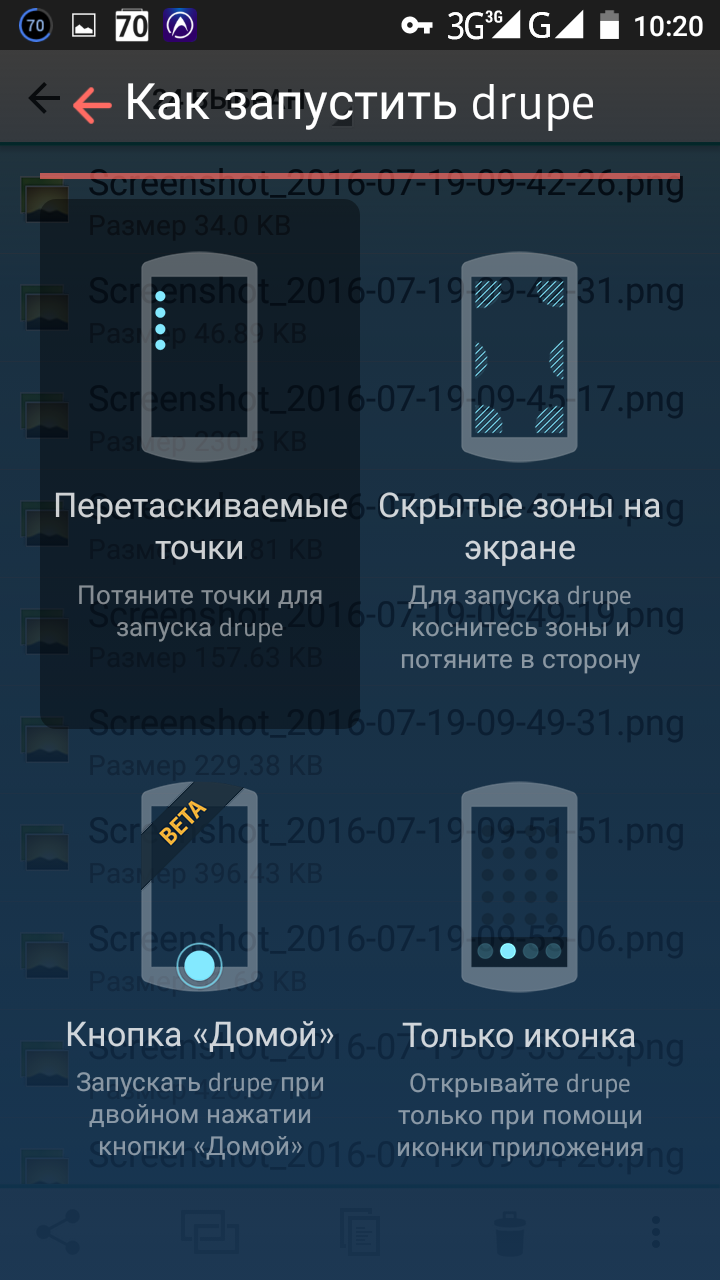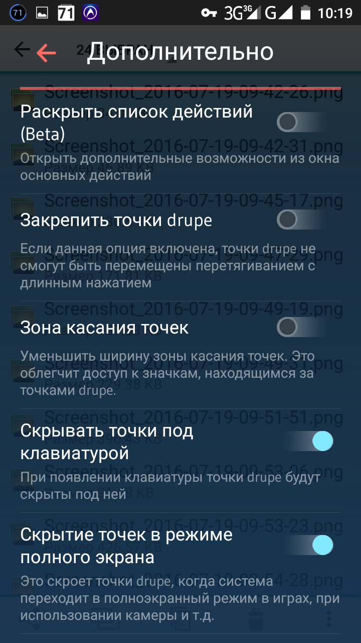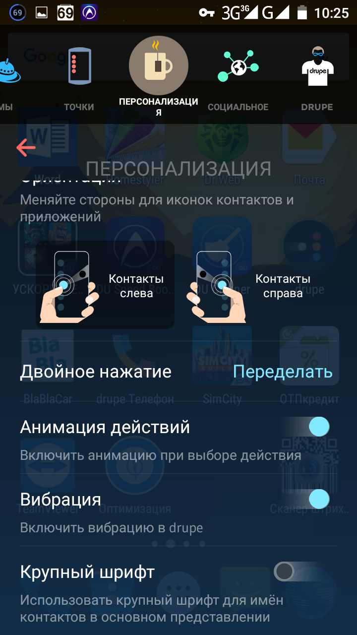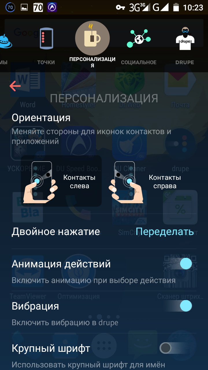 Точки на рабочем столе также можно настроить. Так, вместо них можно использовать аватары, мини-контакты или вовсе отключить эту радость. При этом доступно уменьшить зону касания, скрывать точки под клавиатурой или в режиме полного экрана. Также drupe можно запустить кнопкой «Home» (неудобно на Android 5.0) или делать это традиционно – иконкой.