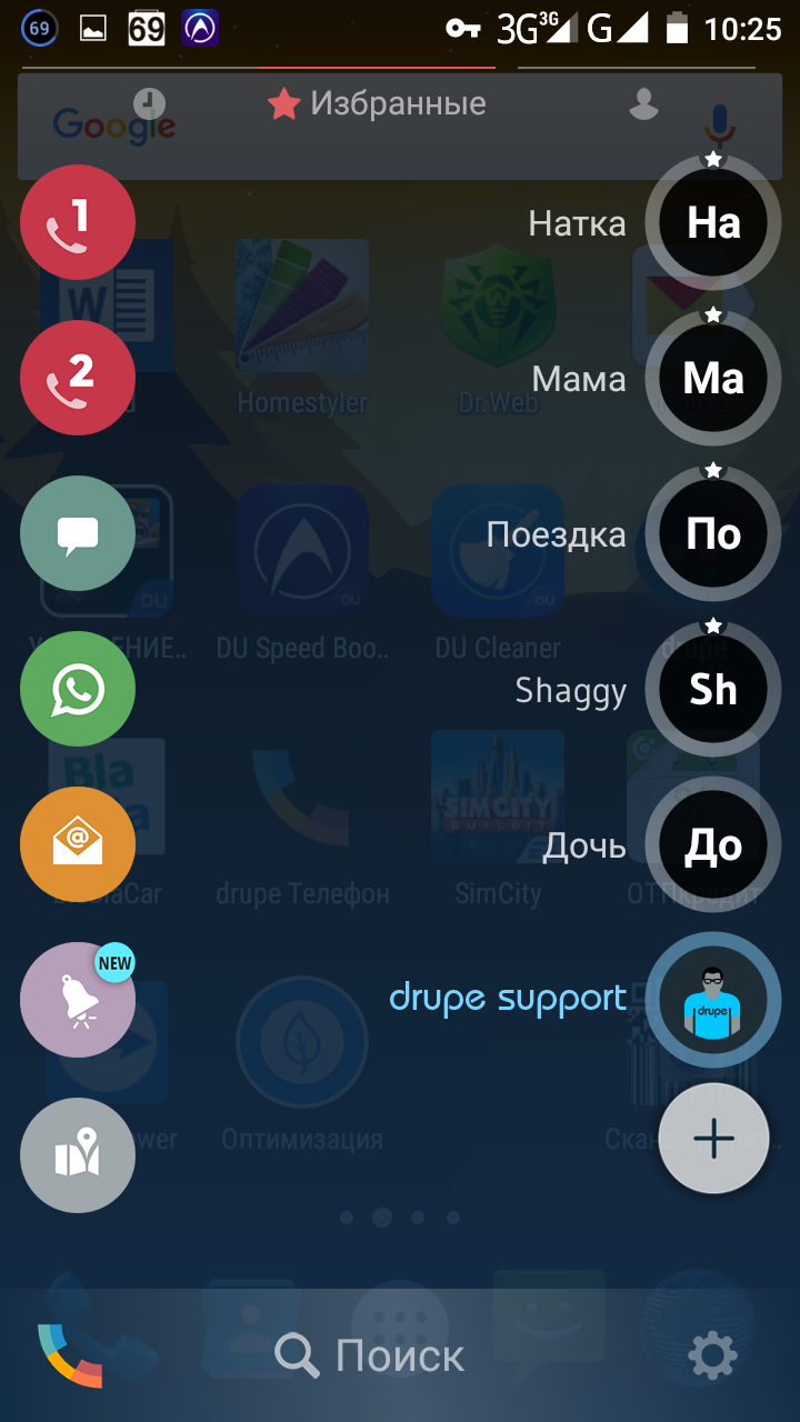 Drupe – это простая непростая звонилка, не обладающая выдающимся функционалом, но оснащенная необычным интерактивным анимированным интерфейсом и возможностью работы с мессенджерами, электронной почтой, картами и прочим.