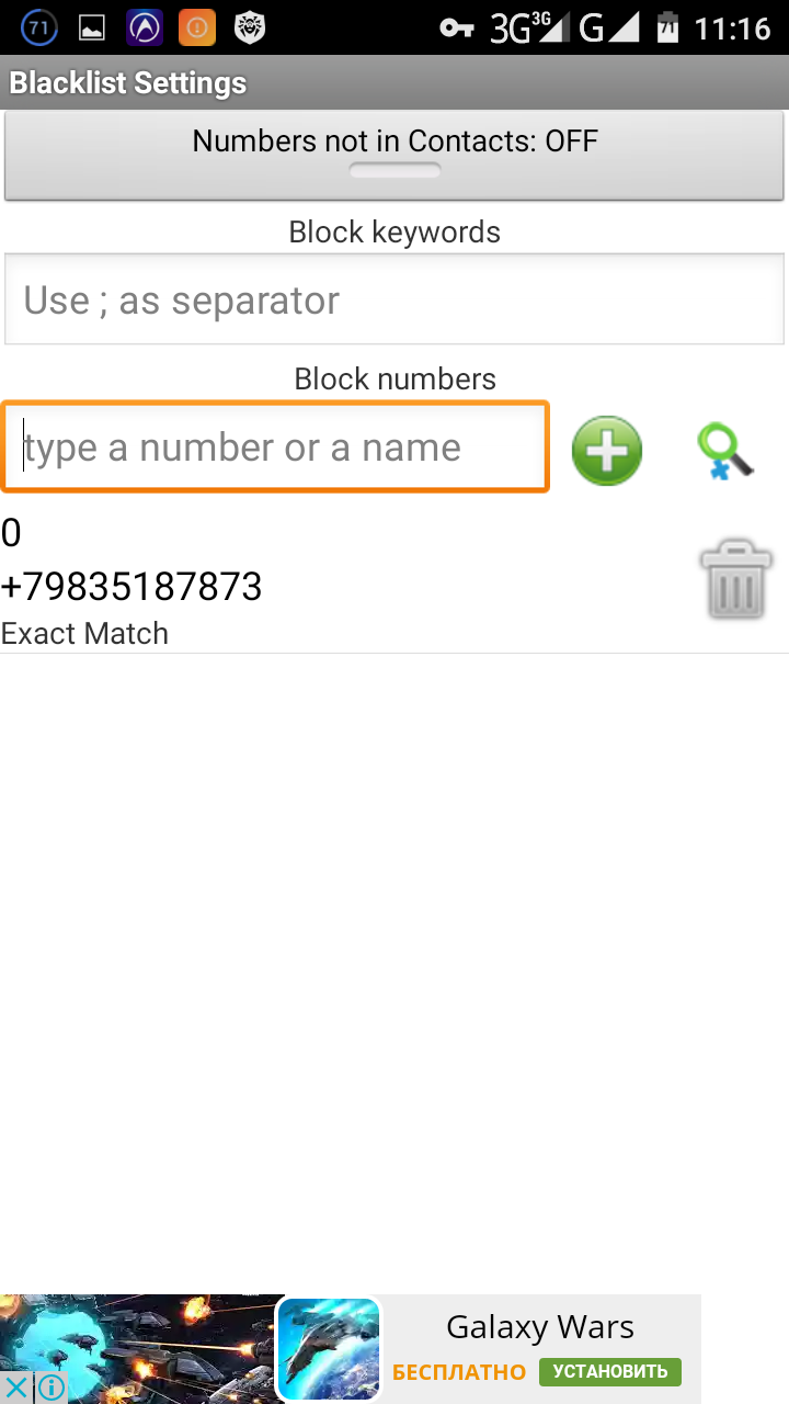 Итак, можно блокировать по фразе в SMS и номеру телефона. При этом номер можно вбить вручную (чего не было у конкурента) или добавить из журнала звонков, SMS-сообщений, телефонной книги или вбить первые цифры «негодяя».
