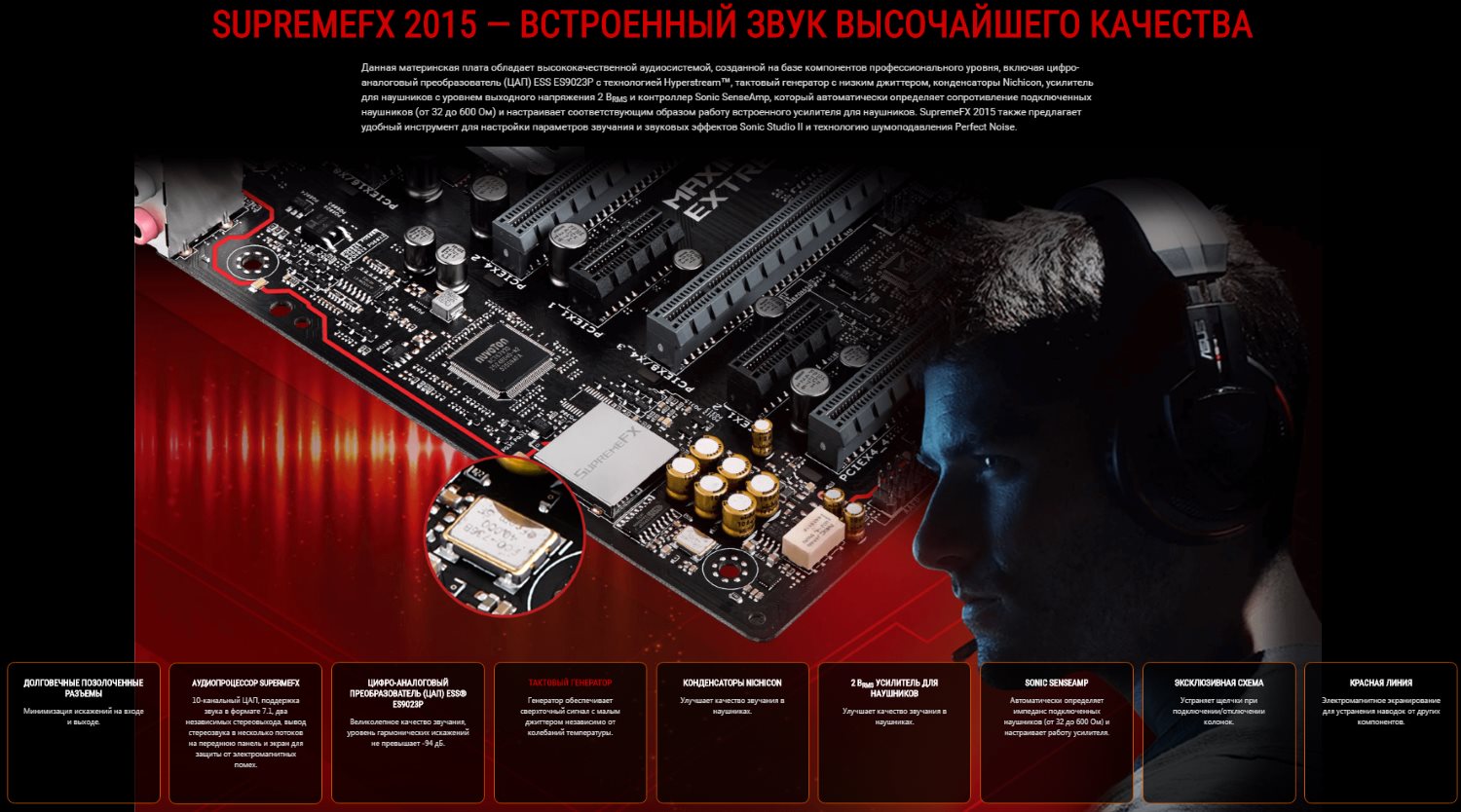Так же, как и на ASUS Maximus VIII Gene, установлен независимый тактовый генератор, японские звуковые конденсаторы Nichicon, а также двойной операционный усилитель Texas Instruments RC4580. Еще здесь используется автоматический определитель сопротивления подключаемых наушников, а также реле-расцепитель, которое щелкает при включении и отключении устройства.