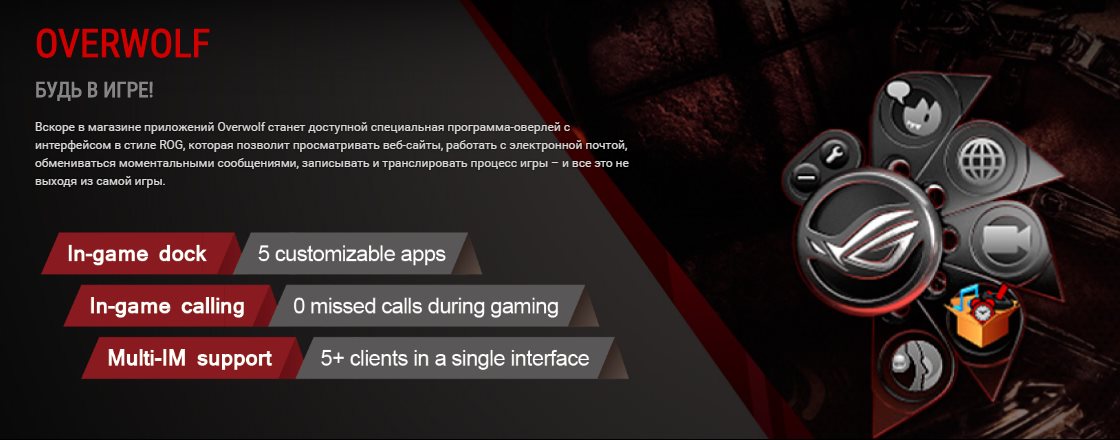 Ниже представлены еще две программные технологии: ROG RAMCache и Overwolf. Первая позволяет выделить часть оперативной памяти под накопитель и использовать его для часто используемых приложений и данных. Вторая является приложением-оверлеем, которое позволяет просматривать сайты, обмениваться сообщениями, записывать видео и много чего другого, не выходя из самой игры.